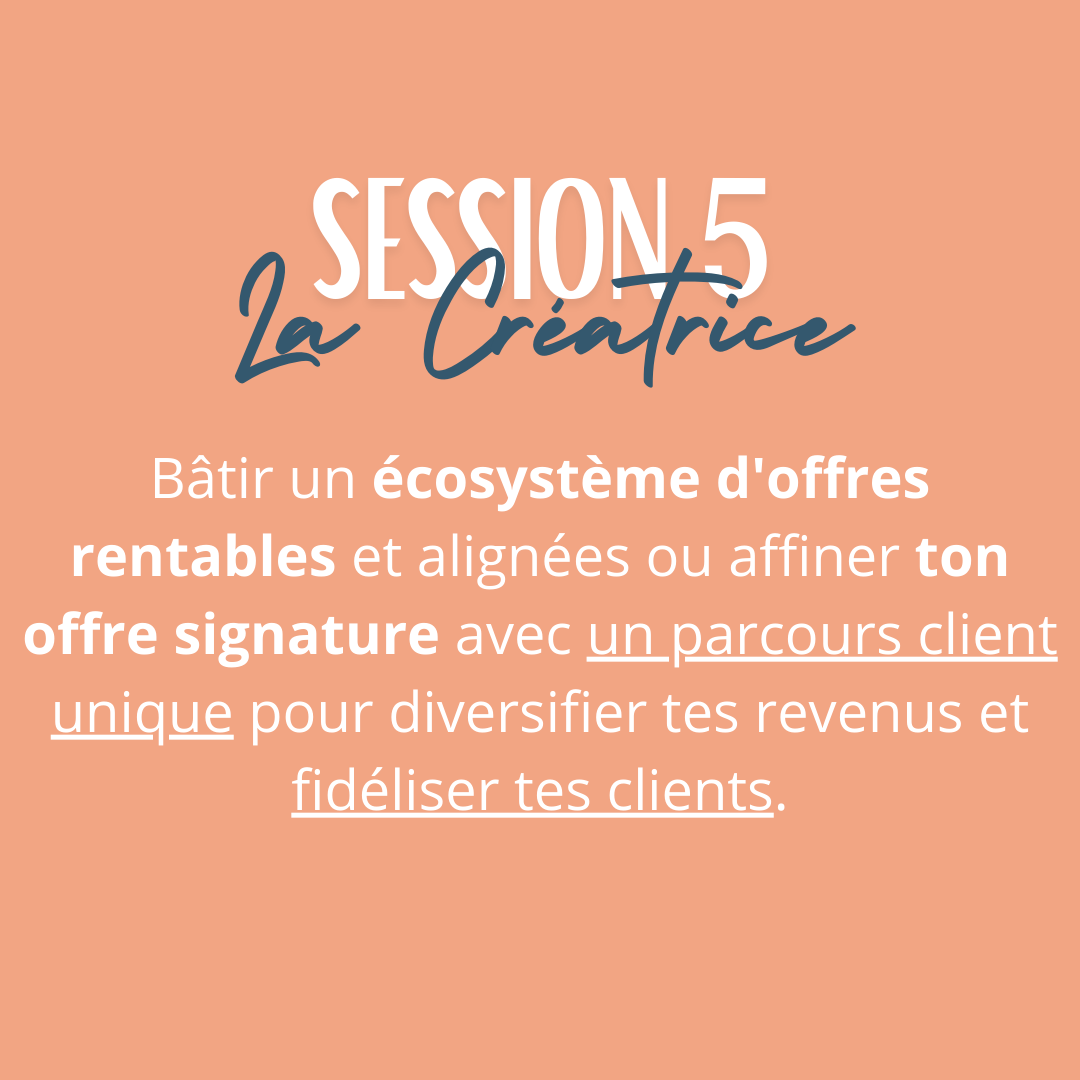 Cet espace va te permettre de repenser ton modèle d'affaires pour qu'il soit plus rentable et écologique pour toi (sortir de la tarification à l'heure et commencer à tarifer en fonction de la valeur que tu apportes), ou déployer de nouvelles offres qui te mettent en joie (offre signature, programme en ligne, podcast) et sont au service de ta vision.